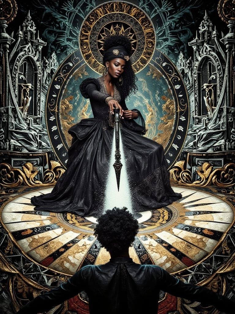 This image shows an African sorceress in a glowing circle, casting a void spell from a jagged wand. Features distorted Rococo graves and a pointillism style with sharp, dark colors, evoking theatrical doom.