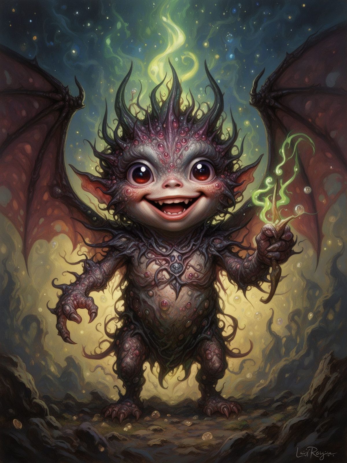 This detailed fantasy illustration features small, surreal creatures with the cutest smiles, rendered in a style reminiscent of classic fantasy artists.