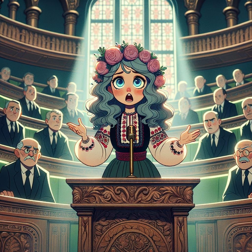 This animated image in a vintage style shows a nervous young girl in traditional Eastern European clothing speaking at a wooden podium. Sunlight illuminates her courageous expression amidst stern onlookers.