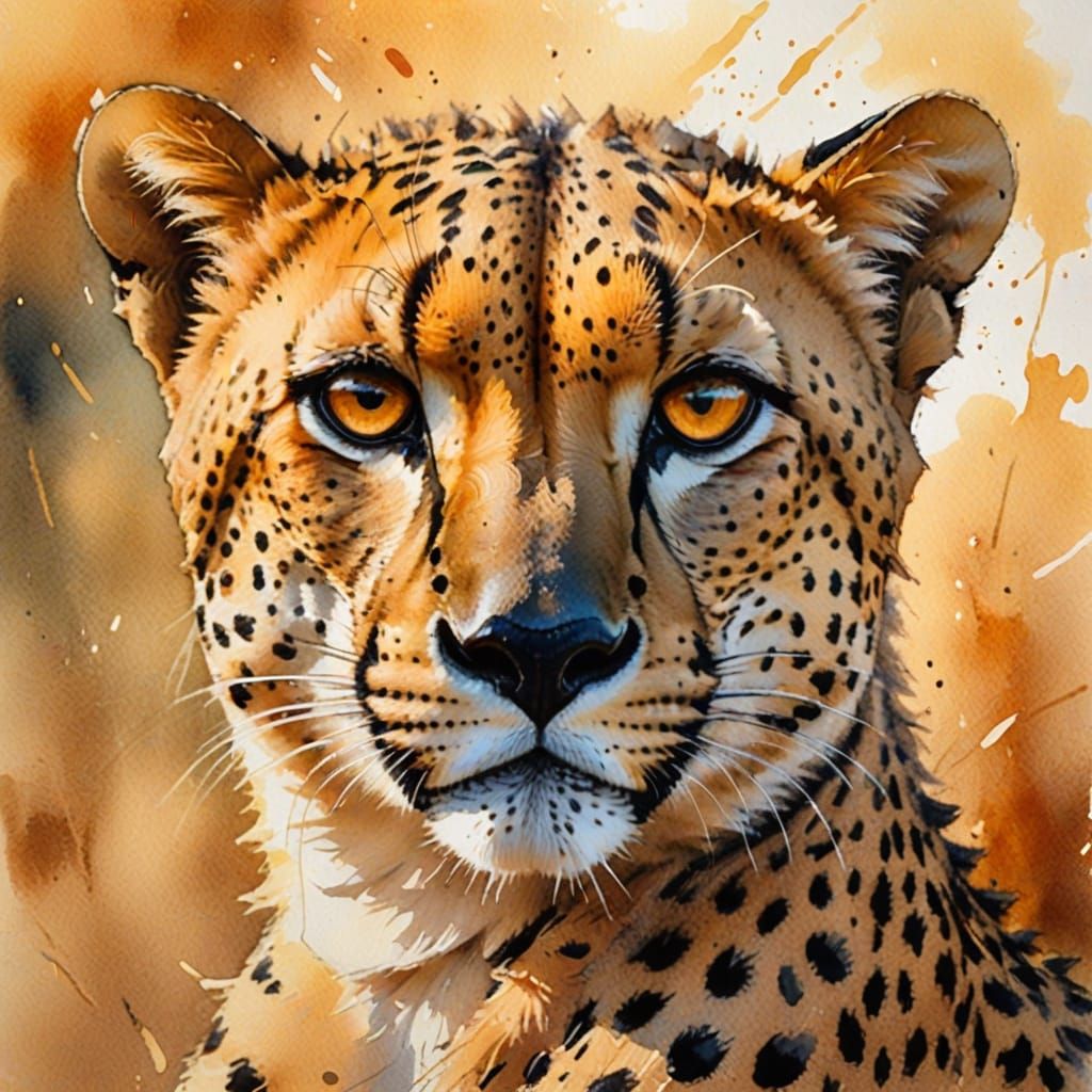 A close-up watercolor portrait of a cheetah's head and shoulders. The artwork features soft, dreamy lighting, expressive fur texture, and a vibrant, energetic feel.