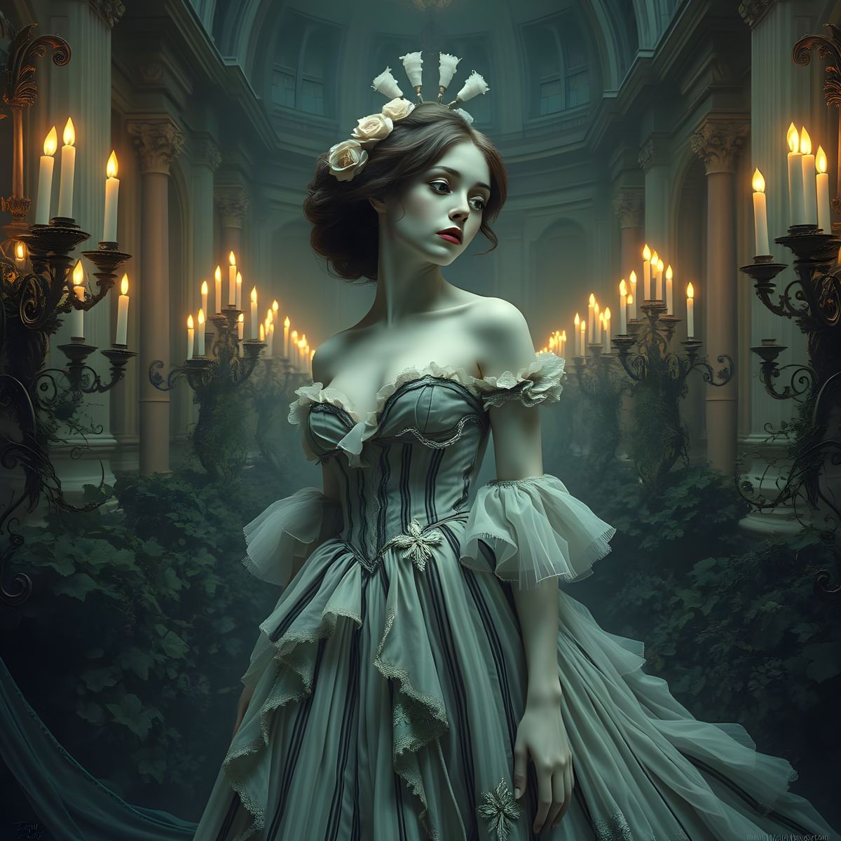 This image shows a pale woman in a torn Victorian dress. Candlelight illuminates baroque architecture in the mixed-media artwork, creating a haunting, decayed aesthetic.