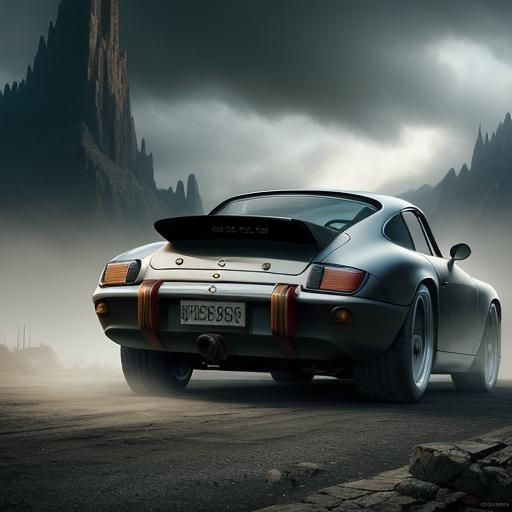 This image shows a vintage Porsche in a dramatic, cinematic style. The digital matte painting features intricate details and an atmospheric, maximalist aesthetic.