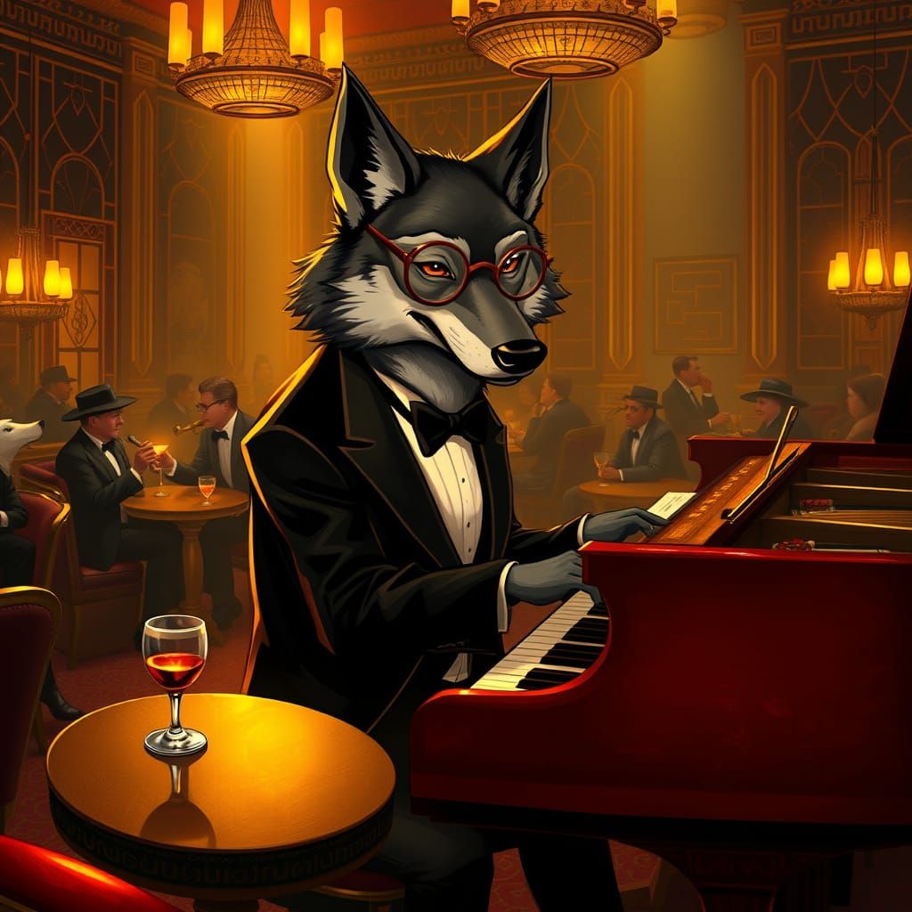 This image shows an anthropomorphic wolf in a tuxedo playing piano in a jazz club. Patrons enjoy music in an Art Deco style, featuring warm colors and steampunk surrealism.