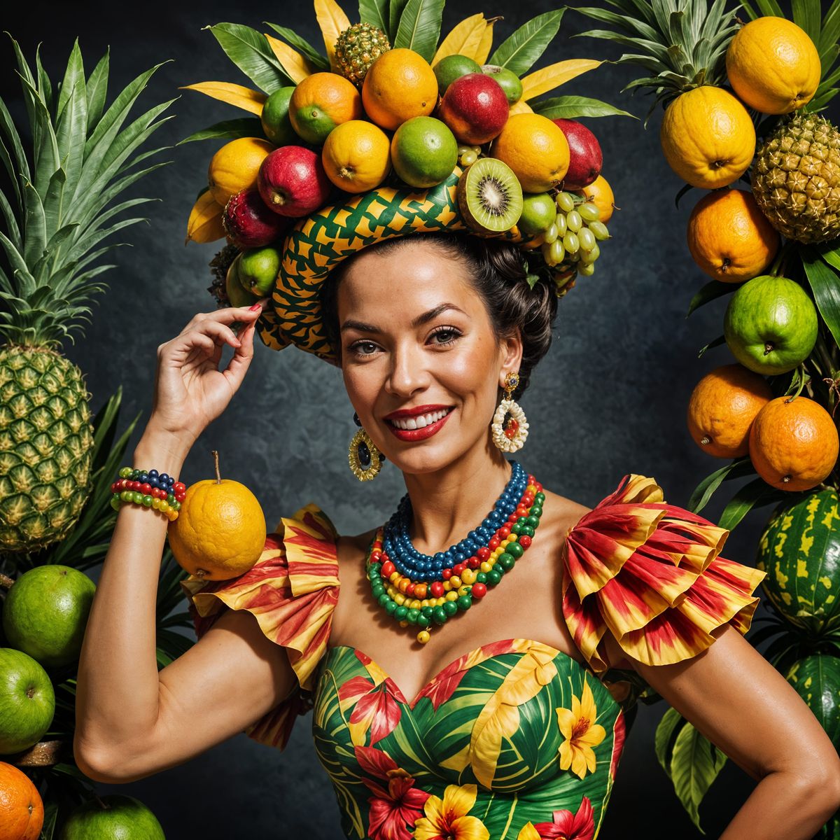 A vibrant image of Carmen Miranda dancing with a tropical fruit hat. The composition is hyperrealistic with intricate details, high contrast, and a cinematic, atmospheric mood.