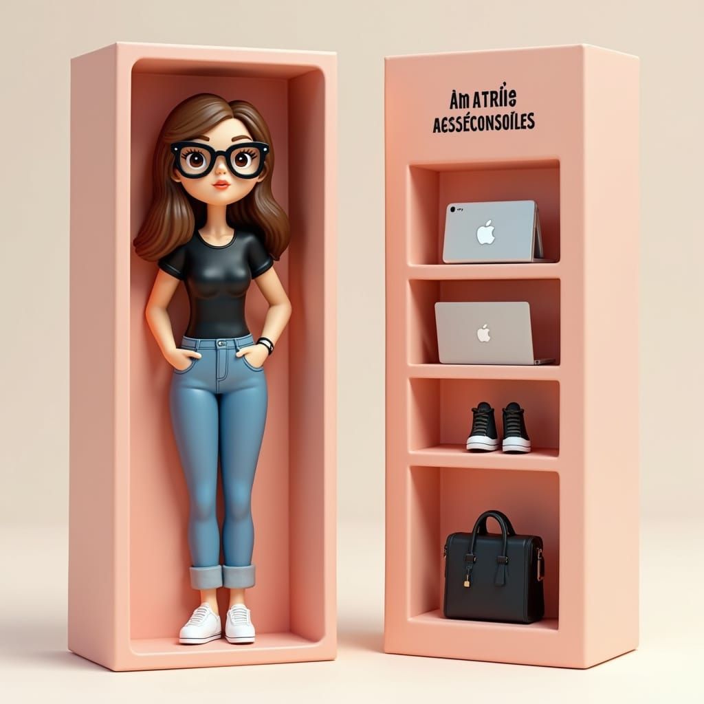 This image depicts a detailed 3D cartoon-style figurine in a vintage-inspired toy packaging, featuring a stylish woman with a minimalist aesthetic, surrounded by accessories in individual moulds, set against a clean and professional background with a touch of warmth and realism.