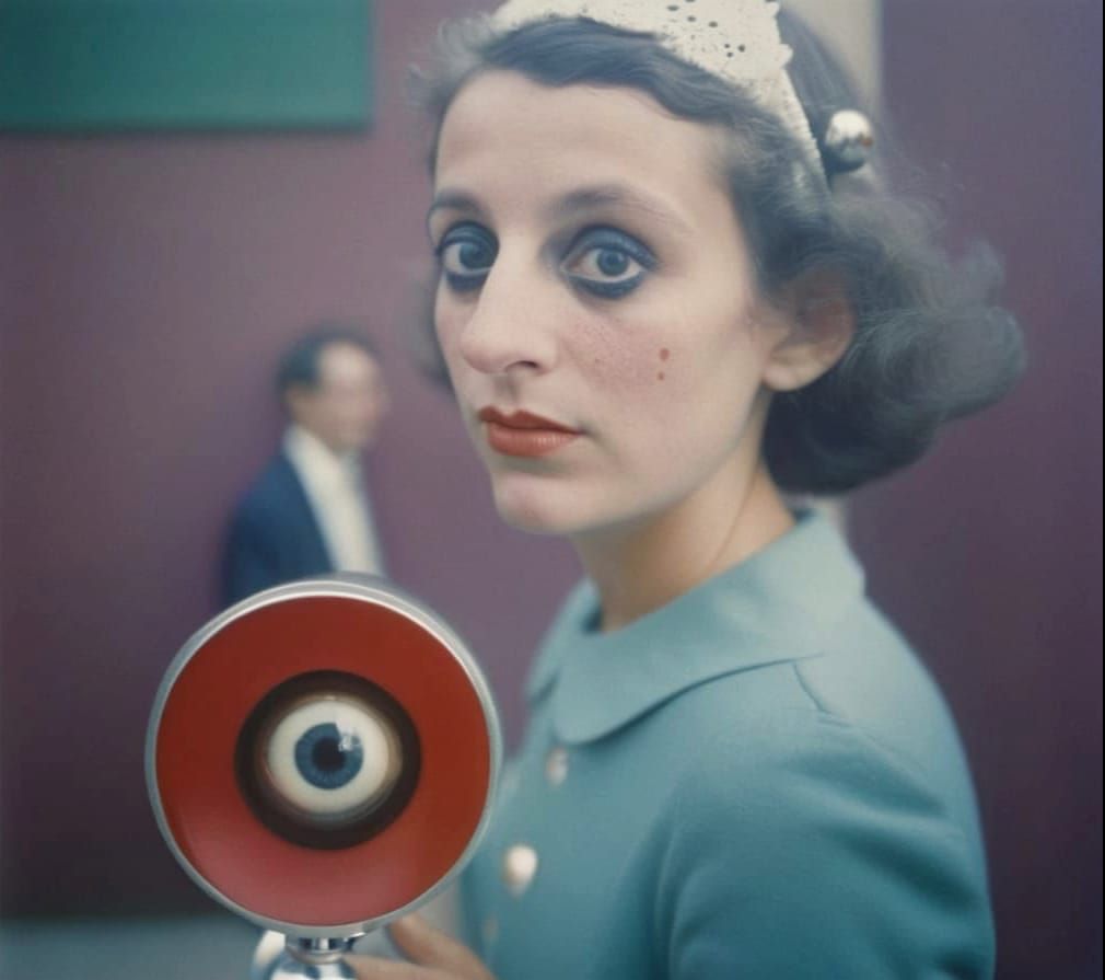 This image features a large halftone print with a white grid overlay and a prominent googly eye, created with a textured, graphic art style.