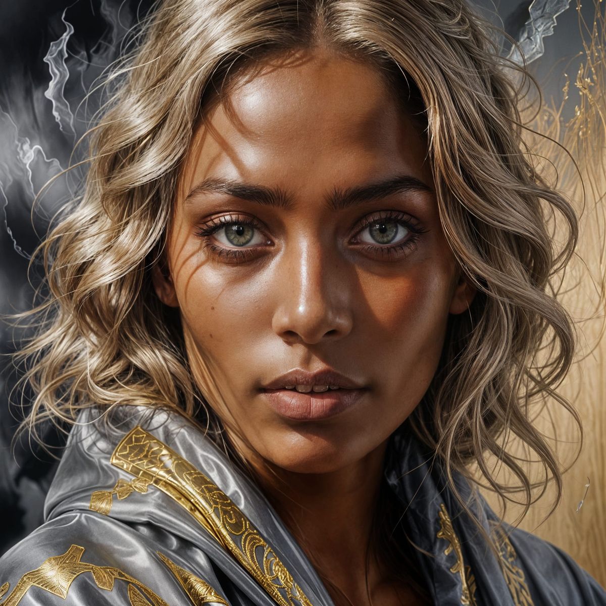 Skin kissed with deep mocha tones, her eyes storm-grey and unblinking, golden hair like sunlit silk framed her face, . Her robe shimmered be...
