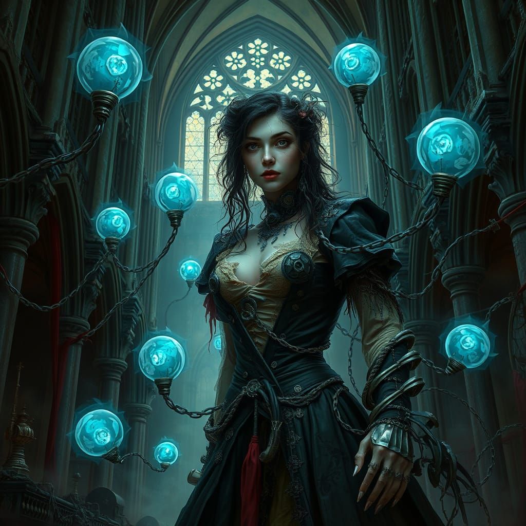 A photorealistic image shows a biomechanical woman in Victorian clothing standing in a Gothic cathedral. Twisted metal and glowing orbs surround her in an eerie display of light and shadow, in a Giger-esque style.