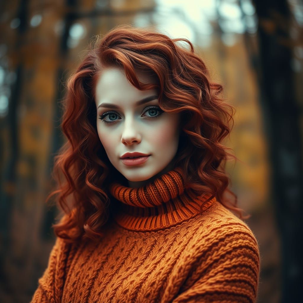 A striking picture of a beautiful red-haired woman in an embroidered sweater posing in an autumn forest. The hyperrealistic image features soft lighting and a sharp focus.