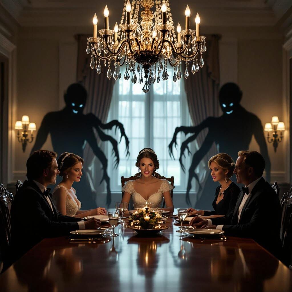 This photorealistic image captures a tense family dinner with unnaturally stiff smiles, dramatic chiaroscuro lighting, and unsettling, elongated shadows hinting at a sinister presence.