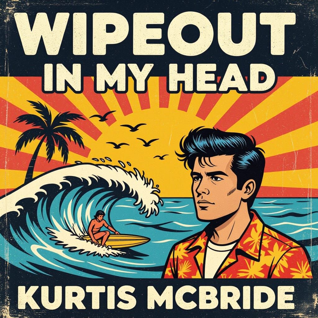 This image combines the nostalgic vibes of 1960s surf culture with the gritty intensity of 1990s grunge, set against a vibrant and psychedelic backdrop.