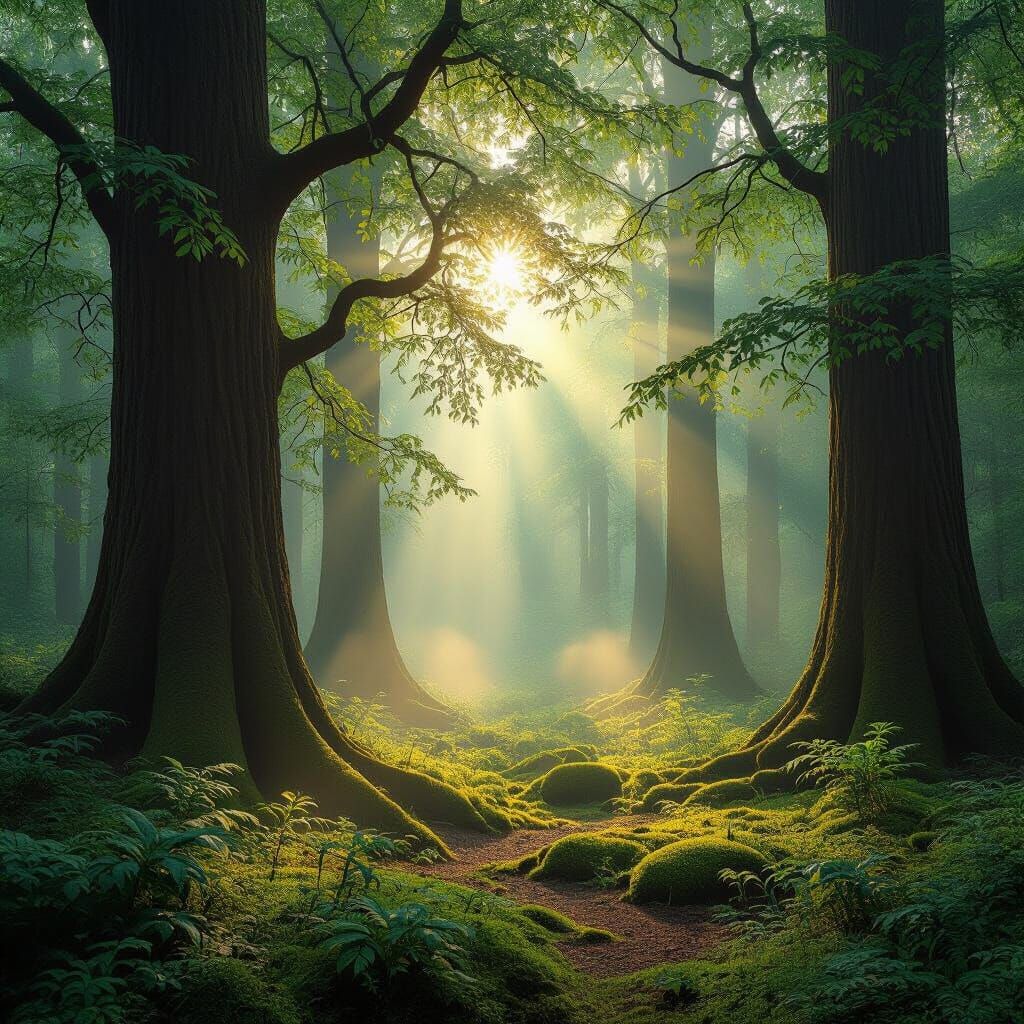 This image depicts a tranquil forest at dawn, with mist rising and sunlight filtering through ancient trees. It features vivid greens and earthy browns, rendered with a romantic, photorealistic aesthetic.