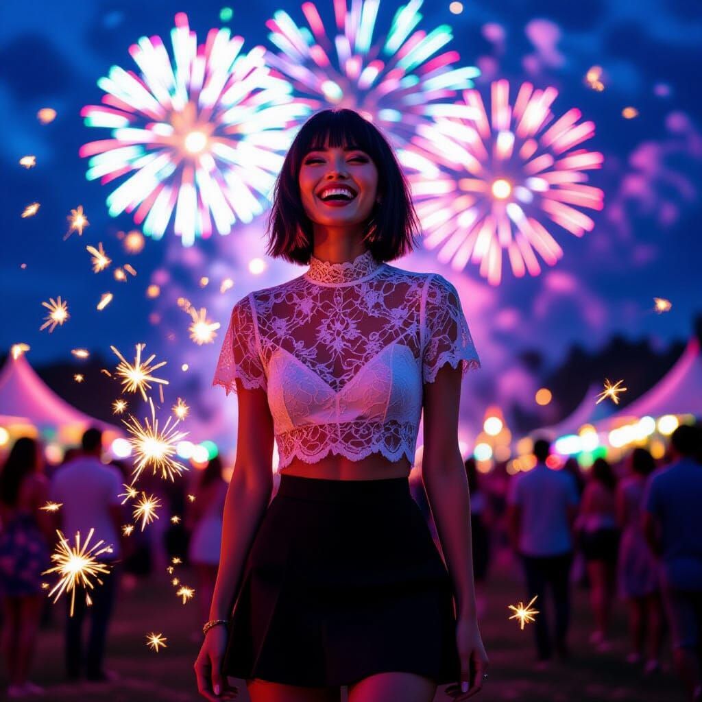 Candid street photography of a radiant woman, with a sleek bob haircut, dressed in a cropped lace top and mini skirt, laughing as sparks fly around her, upper body framing, in a crowded festival setting, under multicolored fireworks, shot at eye level, on a Fujifilm X-T4 with a 35mm lens, in the style ...