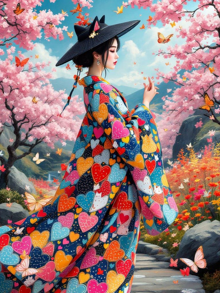 This oil painting depicts a Japanese woman in a vibrant, patterned dress and cat hat, surrounded by butterflies and cherry blossoms in a detailed landscape.