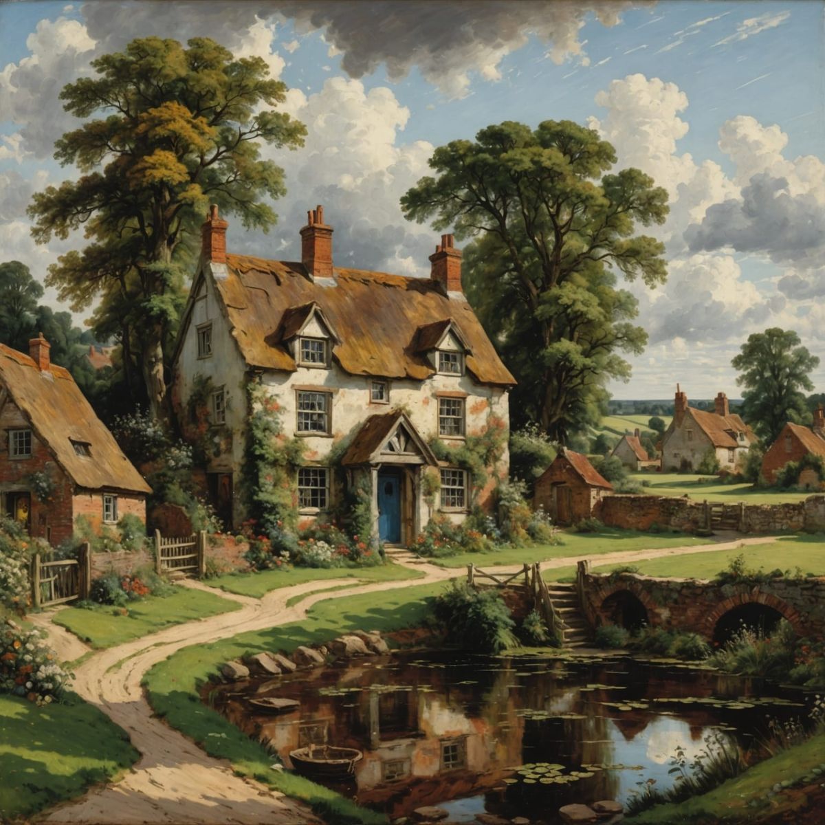 This image showcases a beautiful and detailed country cottage, rendered with radiant colors and intricate features in the style of John Constable's pastoral landscapes.