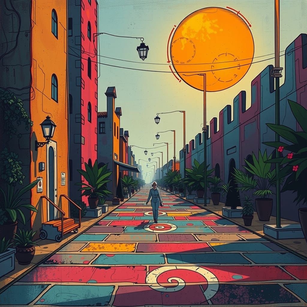 A vibrant alleyway scene with a woman walking amidst pastel buildings and lush vegetation. The image evokes a comic book aesthetic, blending futuristic lines with whimsical machinery.
