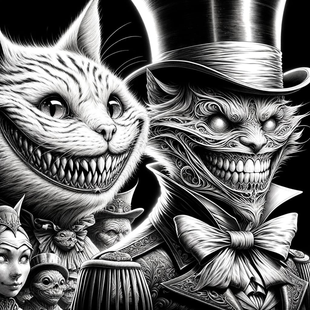 This image showcases a haunting, hyperrealistic depiction of the Cheshire cat and the Mad Hatter, set against a mysterious, royal backdrop in a classic fairy tale horror theme. Created in a detailed, black and white coloring book style, this artwork combines the essence of concept art with the dramatic f...