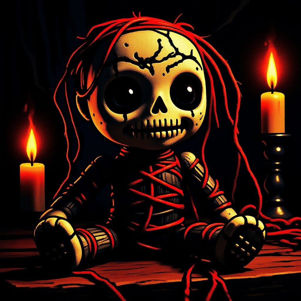 This image features a voodoo doll illuminated by mysterious, dim candlelight, casting eerie shadows. The art style is dark, vibrant, and moody, evoking a graphic novel aesthetic.