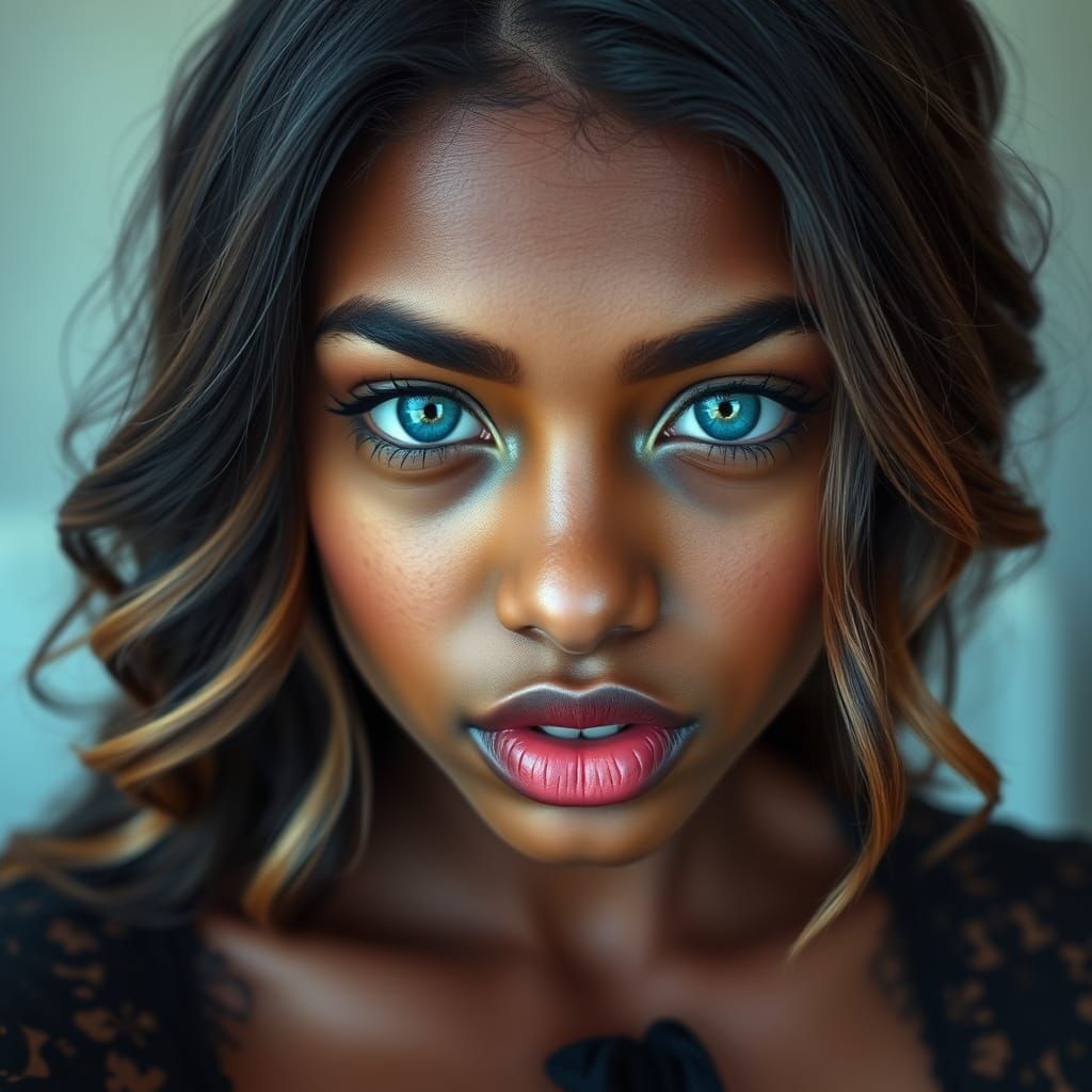 A hyperrealistic close-up portrait of an 18-year-old light-skinned African-American woman with black wavy hair and turquoise eyes. She is wearing a black lace corset, depicted with vibrant colors and expressive features.