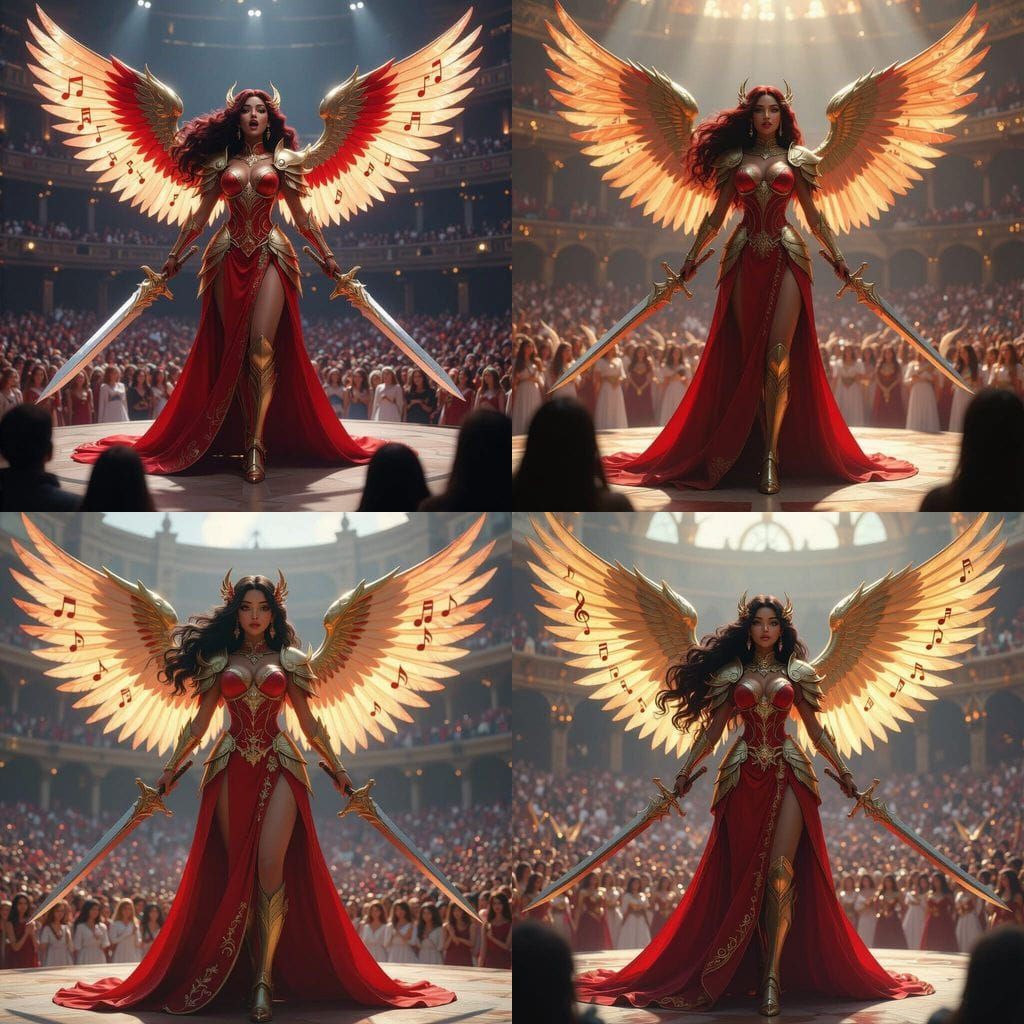 This image depicts a powerful angel with dark skin, red hair, and ornate armor, holding swords. She sings to a crowd in a grand amphitheater, with large wings adorned with musical notes. Rendered in a detailed 3D anime art style.