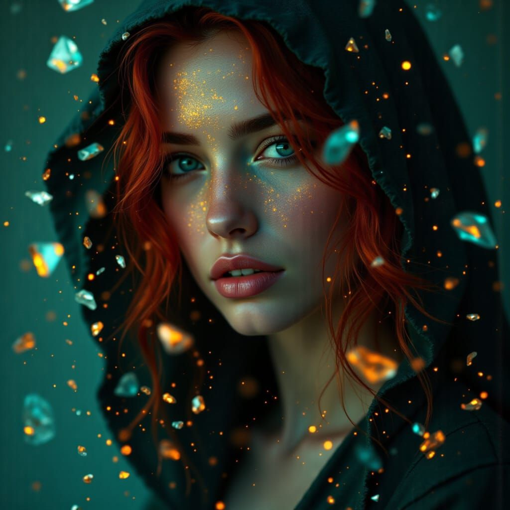 This image shows a portrait of a beautiful red-haired woman in a hood, surrounded by floating crystal shards. The scene features partial desaturation, luminous particles, and a neon noir aesthetic.