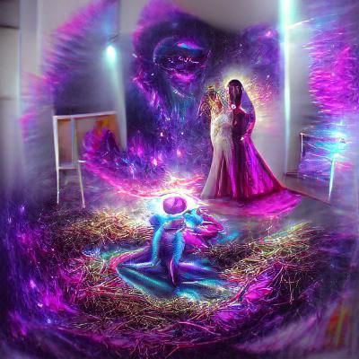 A striking picture of a celestial wedding between a radiant woman and a devil in a purple suit. This mixed media illustration features holographic and cosmic elements.