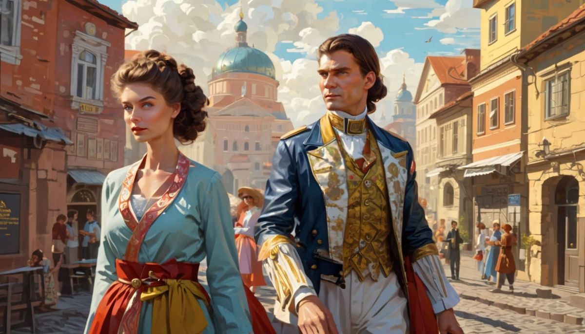 A vibrant cityscape featuring a character within a scenic environment. The piece evokes Russian Constructivism through bold compositions and photomontage elements.