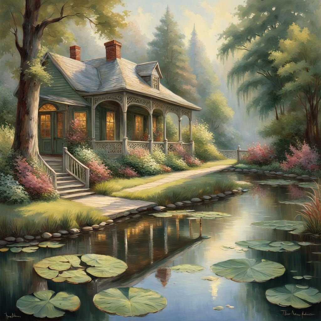 A picturesque outdoor cafe scene with a man and woman enjoying coffee by a pond. The image is rendered in an impressionistic style with soft brushstrokes, warm light, and lush foliage.