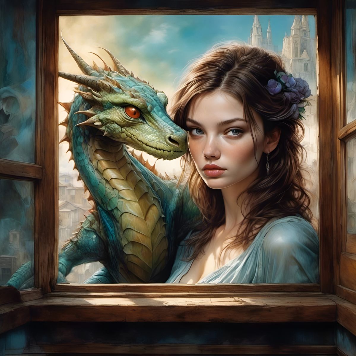A striking close-up portrait of a woman hugging a dragon hatchling. The image is a blend of fantasy and grunge aesthetics, with double exposure and luminism techniques creating a dreamy, highly detailed scene.