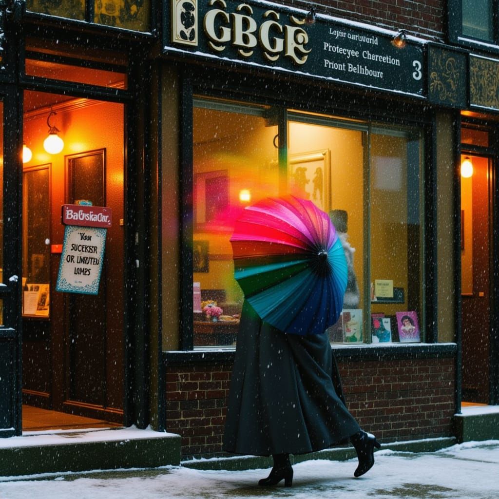 This image shows a solitary woman with a rainbow umbrella on a snowy day, seen through a rain-streaked window. It's rendered in an intimate, painterly photographic style with soft focus and rich colors.