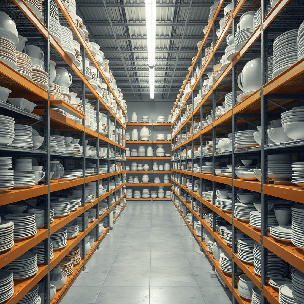 A hyperrealistic 3D render of a dishware storage warehouse. Radiant lighting illuminates rows of fine china and glassware on shelves, with no people present.
