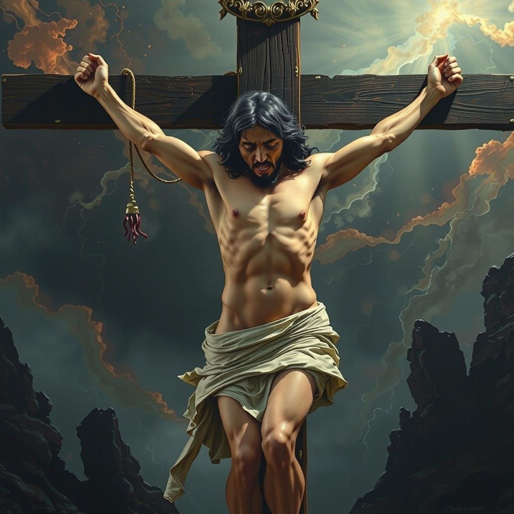 "Full-body portrait of Jesus Christ, dying on a crucifix, set against a dramatic, eerie, and mystical landscape, with a beautiful, anguished face contorted in a mix of pain and serenity. Inspired by the vivid, dreamlike quality of Zdzisław Beksiński's surrealist paintings, the intricate, hand-crafted detail of Simon Stalenhag's concept art, and the atmospheric, high-contrast lighting of Ash Thorp's digital art. The scene is rendered in a highly detailed, matte painting style, with deep, rich colors and bold, complementary hues, evoking a sense of fantasy and mysticism. The image is reminiscent of a splash screen from a fantasy video game, with an 8K resolution that showcases the intricate textures and details of the scene, as if rendered in Unreal Engine 5."