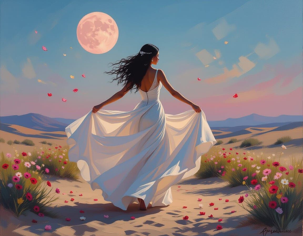 This image shows a bride in a flowing gown dancing in a desert under the moonlight. It features sharp brushstrokes and vibrant colors, evoking a romantic, impressionist style.