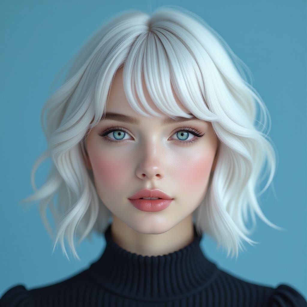 A portrait of a striking albino girl with a layered bob haircut and side-swept bangs, posing against a blue backdrop. The photorealistic image features cinematic lighting and a highly detailed aesthetic.
