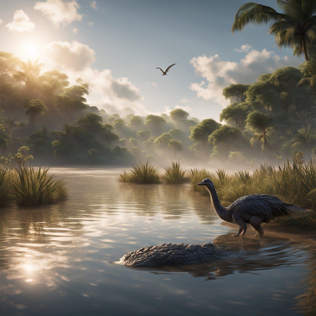This image shows a hyper-realistic digital art of a crocodile ostrich hybrid in a serene lake surrounded by lush greenery, with softly glowing mist and vibrant tropical flowers, captured in cinematic film still quality with high dynamic range and warm golden hour lighting.