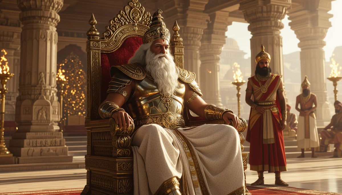 This image shows a regal scene with Bhishma Pitamah on a throne in Hastinapur's court. Crown Princes Pandu and Dhritarashtra are present, alongside Vidur and Guru Dronacharya, in a photorealistic digital rendering.