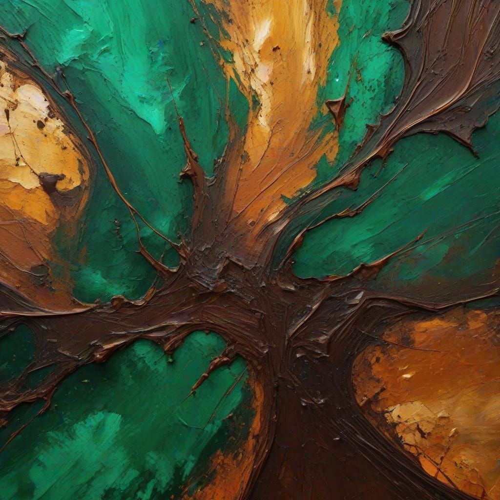This image showcases an abstract texture with emerald hues, rendered in a grainy impressionist style. The artwork evokes a sense of depth and organic form.