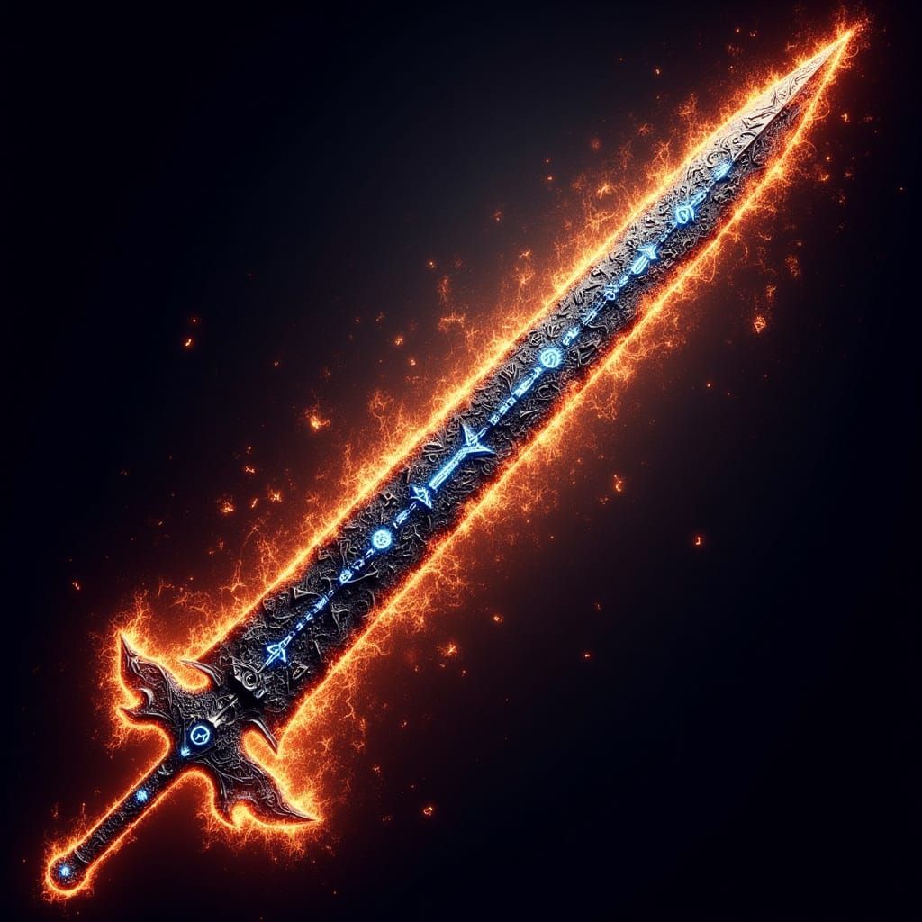 A mighty sword with glowing blue runes and flames dancing across its length, casting a warm golden glow on the surrounding environment, radiating raw power and unbridled fury.