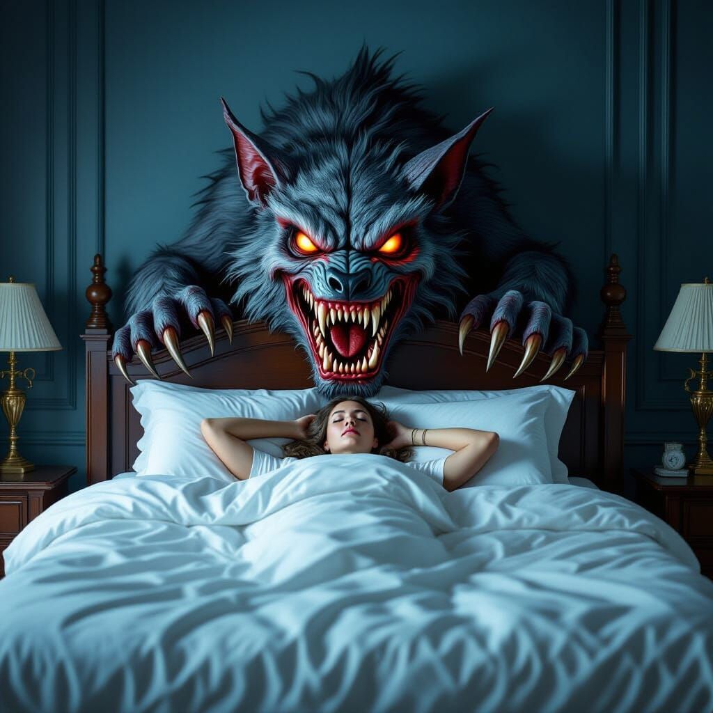 This image depicts a person trying to sleep in a grand bed, confronted by a terrifying demonic creature. Rendered in a surreal, dreamlike style with bright colors and dramatic lighting, it evokes intense dread and vivid nightmare imagery.