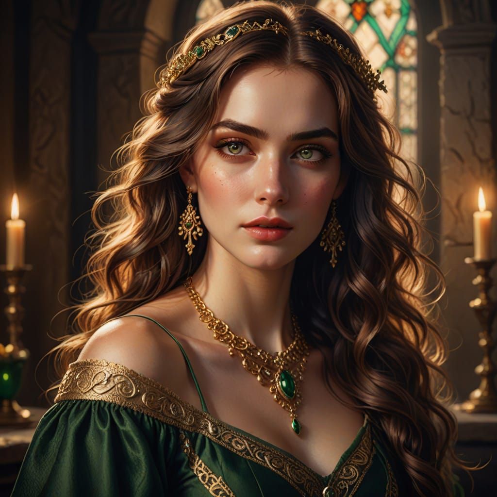 A captivating portrait of a young woman with long wavy brown hair, green eyes, and fair skin, set against a Renaissance-inspired backdrop of intricate gold jewelry and luxurious fabrics, with soft focus and vivid colors.