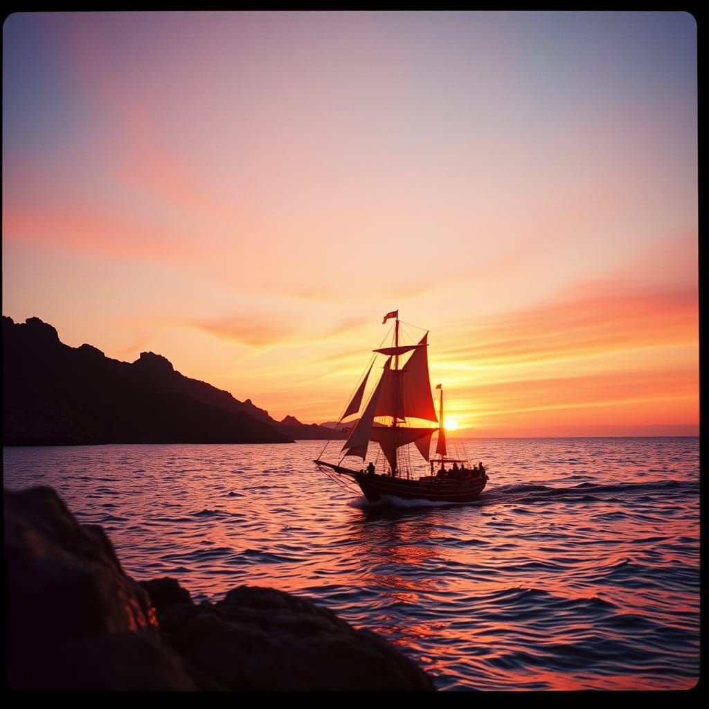 A hyperrealistic image showing a siren watching the sunset from rocks as Ulysses' ship sails by. The image is cinematic, with film grain and dramatic, atmospheric lighting.