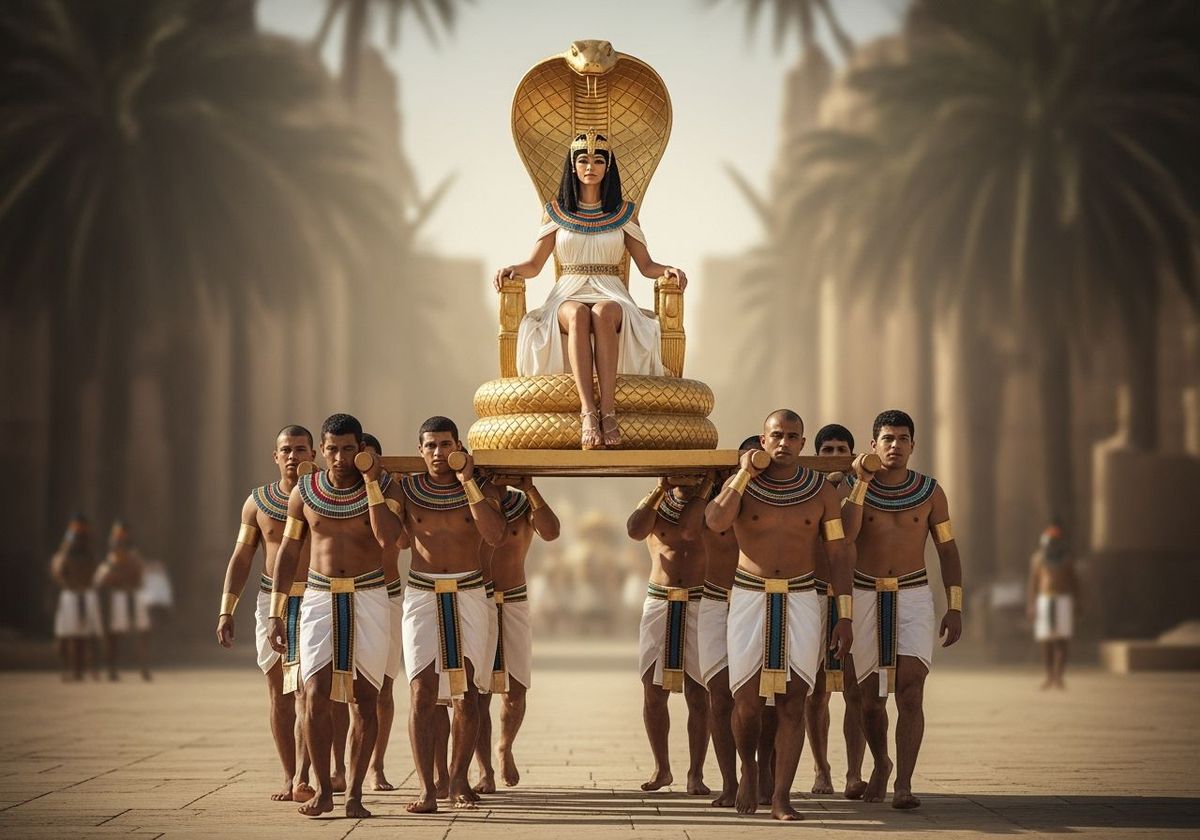This image shows an Egyptian queen on a cobra-shaped golden throne. The throne is carried by servants in soft, warm light with a shallow depth of field. The image is reminiscent of professional photography.