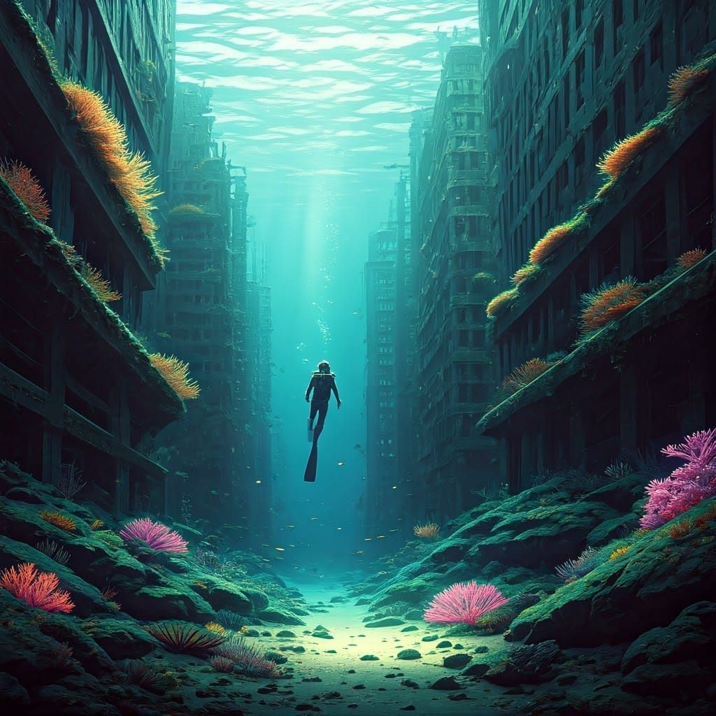 This image shows a lone diver in a vintage wetsuit exploring the skeletal remains of a submerged metropolis, where coral and algae dominate, and glowing creatures scurry through the ocean floor. A blend of digital surrealism and magical realism, the artwork combines futuristic details with a natural, sun...