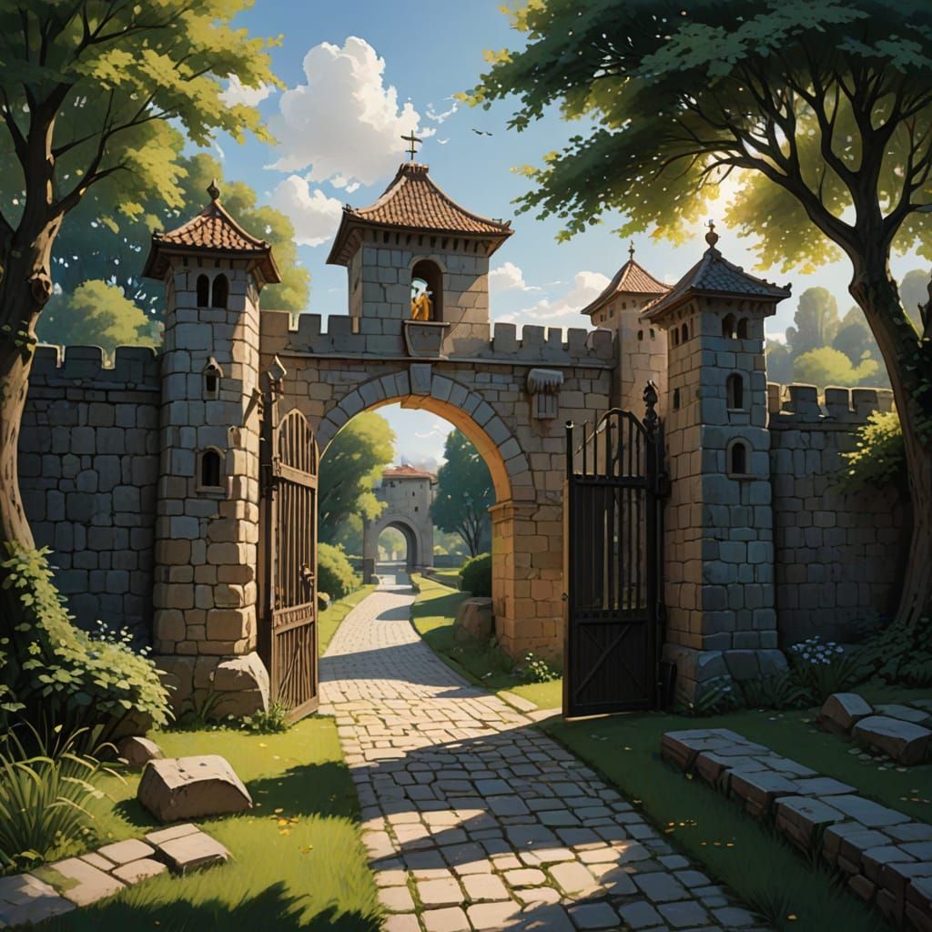 A walled city fortress blending Italian Romanesque and Catholic styles, symbolizing strength and openness with wide gates and a welcoming atmosphere under warm sunlight.