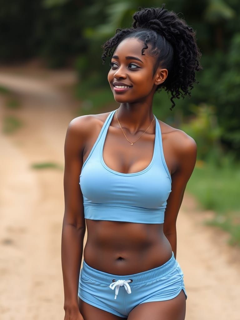 A beautiful black woman with curly hair in a sports bra and shorts stands outdoors. Soft blurred green foliage and a dirt path form the background.