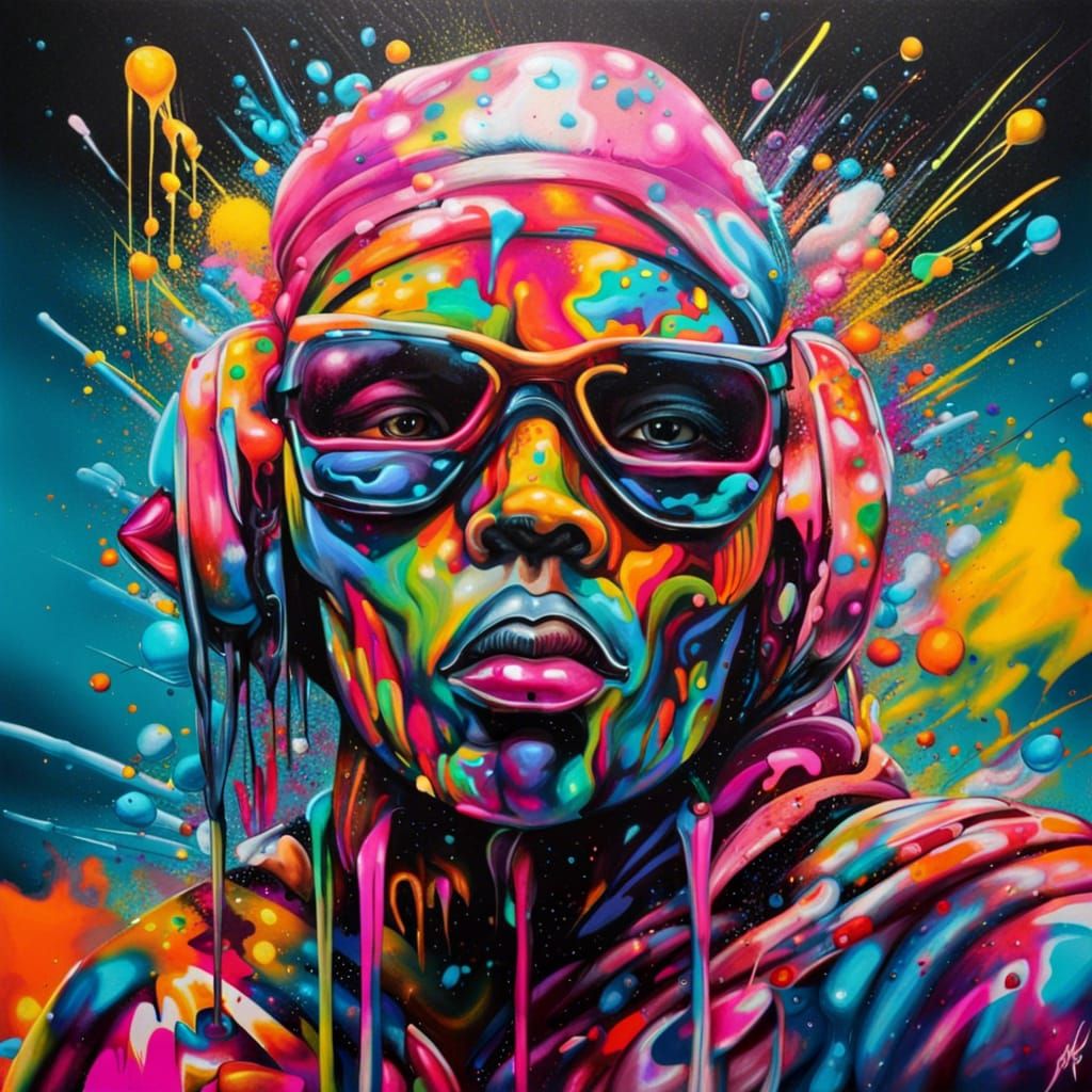 A hyperrealistic graffiti art image of a powerful, godlike guardian. The artwork features a vibrant, polychromatic color scheme with cool, neon hues and high contrast details.