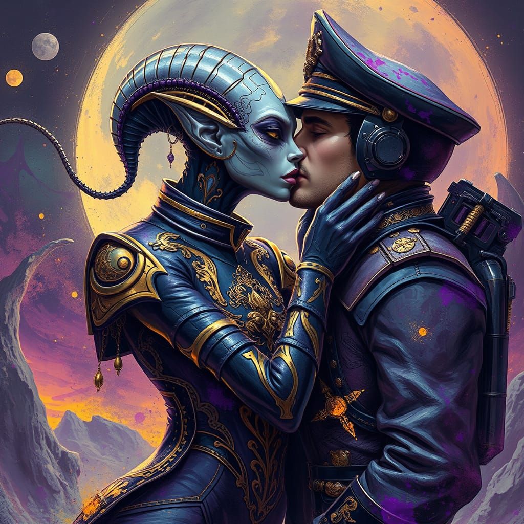 A striking picture of a female alien in a space captain's uniform kissing a human captain on an alien planet. The image is reminiscent of dark fantasy concept art with rich colors.