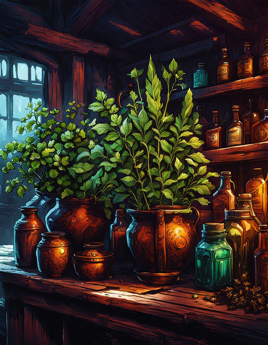 A detailed sketch of various herbs in cool colors. The image has an ethereal, otherworldly quality, rendered with alcohol ink in 8k resolution.