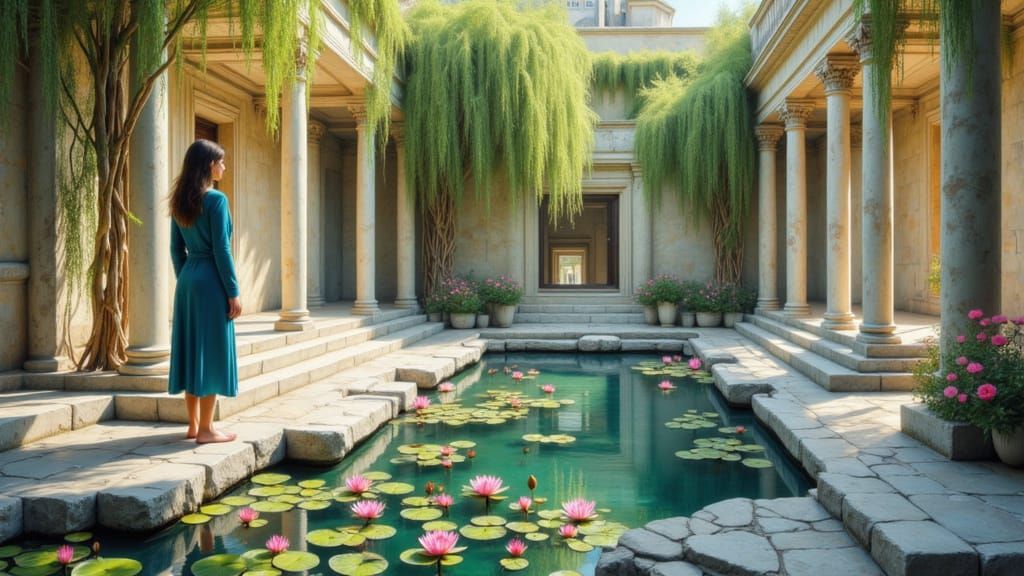 This image features a tranquil woman near an indoor pond, surrounded by marble elements and lush waterlilies. Willow trees add to the peaceful scene, rendered with soft brushstrokes.