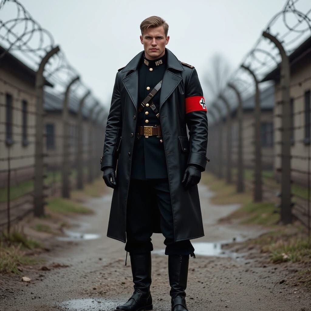 This image shows a young, attractive officer in a dark uniform at a prison camp. The subject's face is sweaty and unshaven, giving him a menacing look, in a photorealistic style.